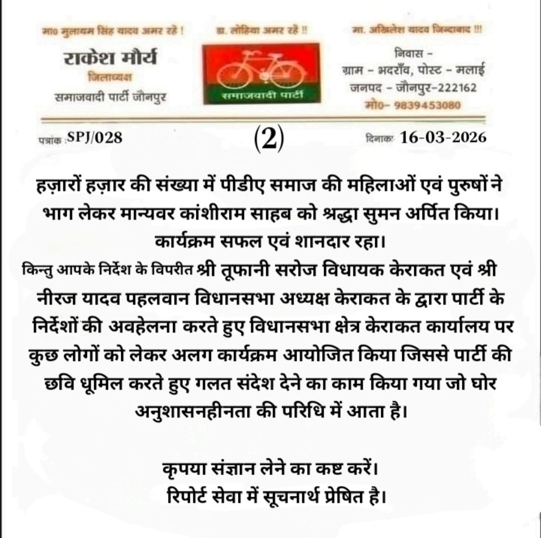 Shareजौनपुरकेराकत विधायक तूफानी सरोज के खिलाफ अनुशासनहीनता का आरोप लगाकर जिलाध्यक्ष राकेश मौर्य ने अखिलेश यादव को लिखा पत्र