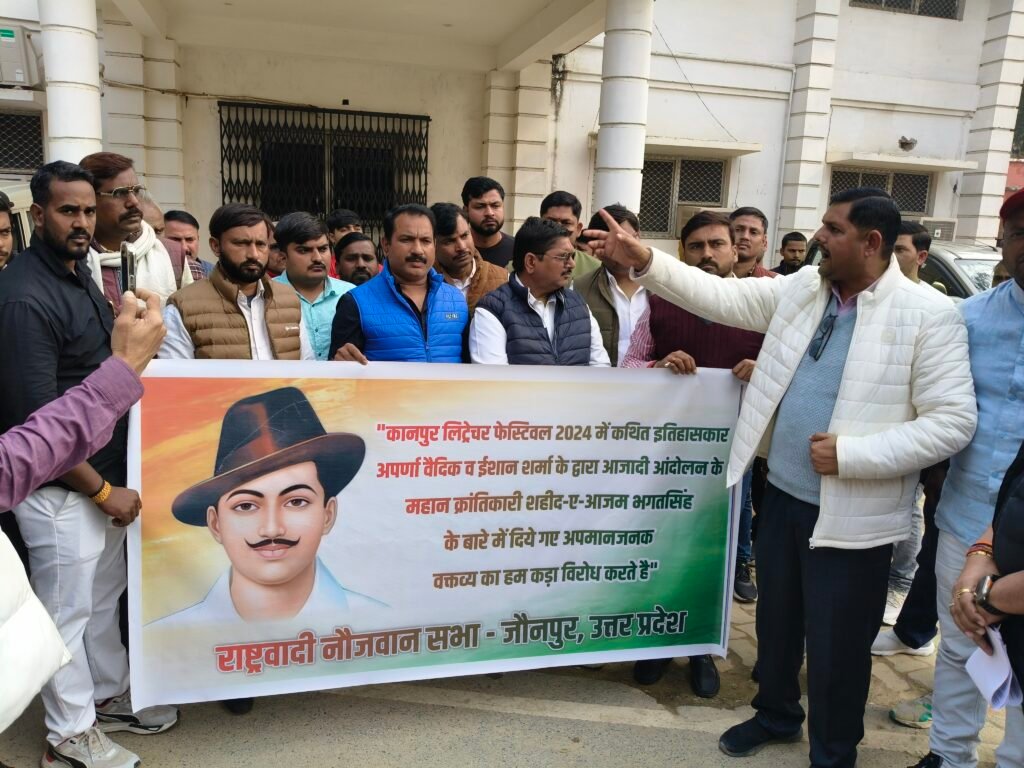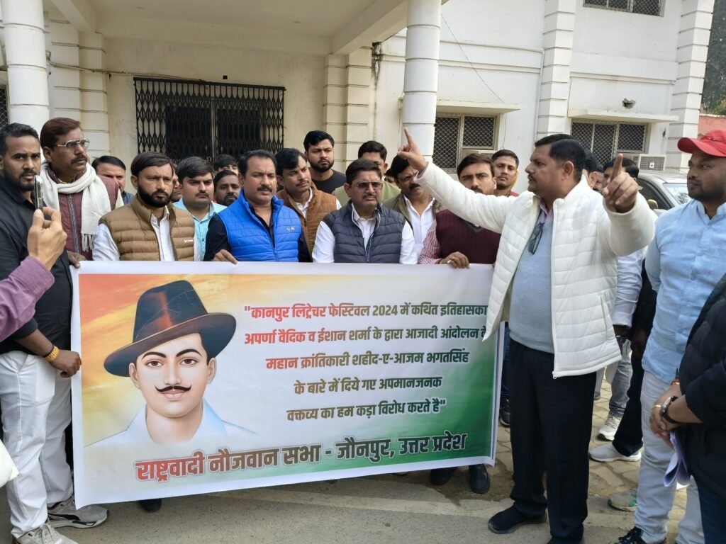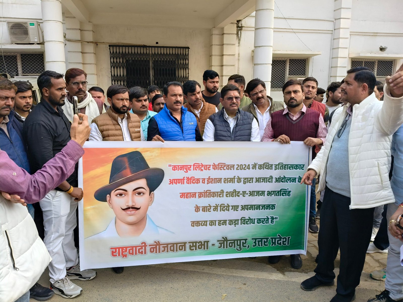 जौनपुर के कलेक्ट्रेट परिसर में राष्ट्रवादी नौजवान सभा के अध्यक्ष नवीन सिह अपने समर्थकों के साथ कानपुर शहर में लिट्रेचर फेस्टिवल में मुख्य अतिथि के रूप में इतिहासकार अपर्णा वैदिक द्वारा अपने इंटरव्यू में शहीद भगत सिंह को आराम तलब व बहरूपिया कहा और होटल के मैनेजर से सेटिंग करके मुफ्त खाना खाते थे जेल में अनशन के दौरान उनका वजन बढ़ गया था क्योंकि वह चुप-चुप कर खाना खाते थे इस शर्मनाक व निन्दनीय वक्तव्य के आहत छात्रों व नौजवानों में व्यापक आक्रोश है जिसको लेकर आज जौनपुर राष्ट्रवादी नौजवान सभा के कार्यकर्ताओं ने डीएम को ज्ञापन सौपा व कार्रवाई की मांग की कहा कार्रवाई न होने पर हम आंदोलन के लिए बाध्य होंगे।राष्ट्रवादी नौजवान सभा के कार्यकर्त्ताओ ने डीएम कार्यालय के सामने भगत सिह पर किये गये बयान पर माफी मागने की माग की और जमकर नारेबाजी की l