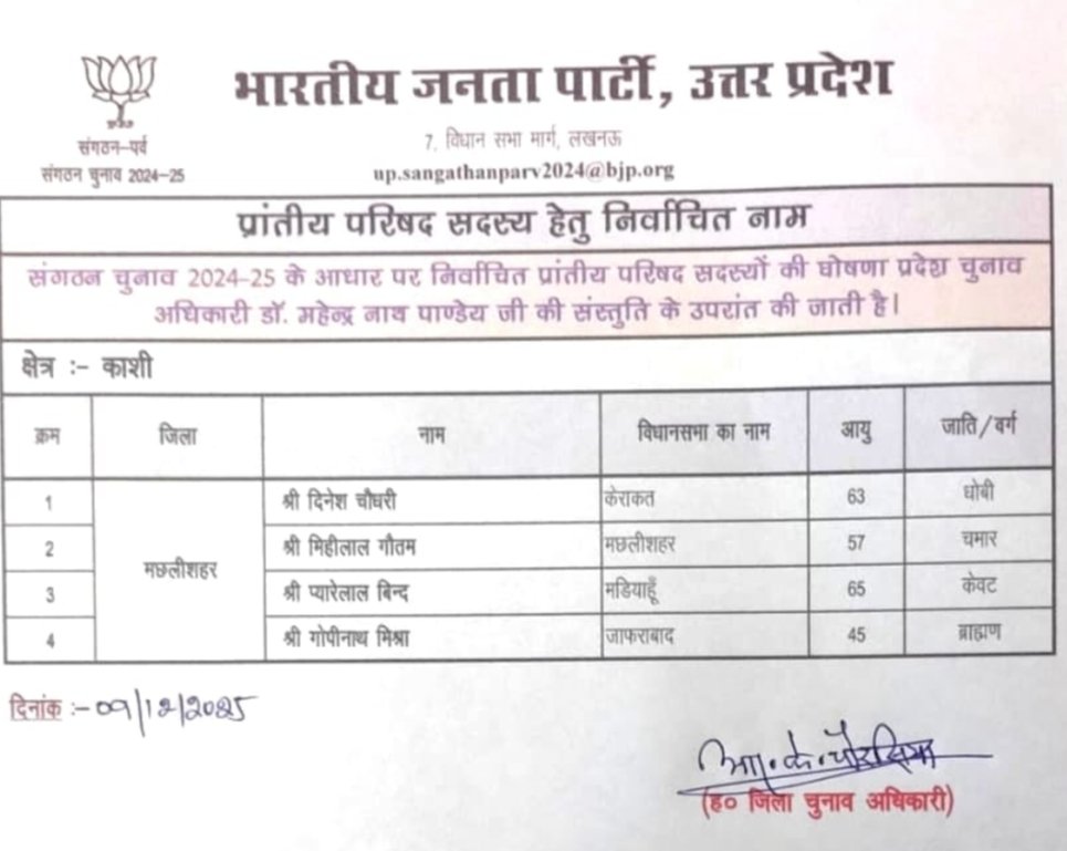 विधानसभा क्षेत्र केराकत के पूर्व विधायक दिनेश चौधरी को भारतीय जनता पार्टी उत्तर प्रदेश संगठन द्वारा प्रांतीय परिषद का सदस्य निर्वाचित किए गया शुभकामनायें देने वालो का लगा ताता