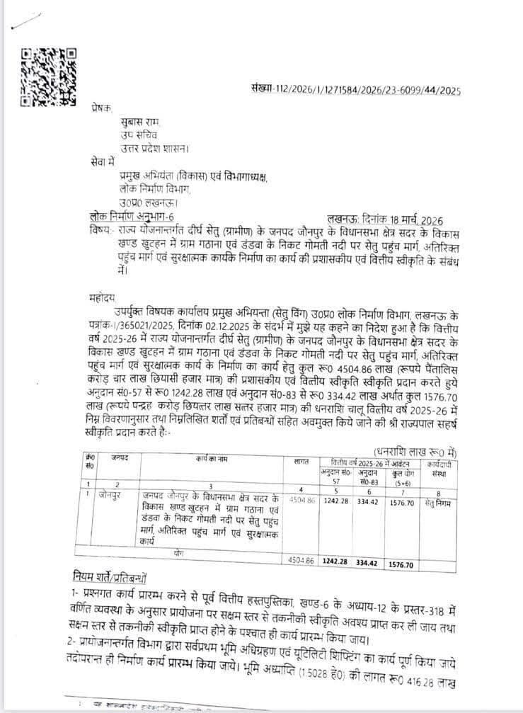 जौनपुर। प्रदेश के खेल व युवा कल्याण राज्यमंत्री एवं जिले के विकास पुरूष गिरीश चंद्र यादव की पहल पर जनपद को एक और बड़ी सौगात मिल गई है। राज्यमंत्री श्री यादव की पहल को बेहद ही गंभीरता से लेते हुए प्रदेश के मुख्यमंत्री योगी आदित्यनाथ ने सदर विधानसभा के आखिरी छोर पर स्थित खुटहन विकास खण्ड के गठाना-डंडवा गांव के निकट गोमती नदी पर एक और पुल निर्माण की स्वीकृति प्रदान की है। उक्त पुल निर्माण हेतु करीब 45 करोड़ 5 लाख रुपए का भारी भरकम बजट स्वीकृत किया है। जनपद में विकास को गति देते हुए प्रदेश सरकार के खेल व युवा कल्याण राज्यमंत्री गिरीश चंद्र यादव के अथक प्रयास से प्रदेश सरकार के मुख्यमंत्री योगी आदित्यनाथ ने वित्तीय वर्ष 2025-26 राज्य योजनान्तर्गत जनपद के गठाना एवं डंडवा गांव के निकट गोमती नदी पर सेतु निर्माण हेतु 45 करोड़, 4 लाख, 86 हजार रूपये की प्रशासकीय एवं वित्तीय स्वीकृति प्रदान की है। उक्त पुल के निर्माण से जिले के विकास को और गति मिलेगी तथा स्थानीय जनता आदि को विशेष लाभ प्राप्त होगा। उक्त पुल के निर्माण से वहां आसपास की जनता को लगभग 20-25 किमी दूरी की यात्रा कम होगी।