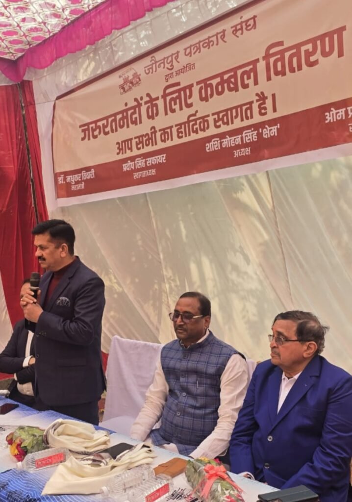 सरकारी योजनाओं का लाभ पात्र लोगों तक पहुंचे, इसके लिए हम सदैव प्रयत्नशील रहते है। सरकार के साथ-साथ समाज के अन्य लोग भी विशेषकर पत्रकार बंधु भी ऐसे कार्यों में लग जाये ंतो इसका महत्व और भी बढ़ जाता है। उक्त उद्गार जिलाधिकारी डा. दिनेश चन्द्र ने जौनपुर पत्रकार संघ द्वारा आयोजित कंबल वितरण कार्यक्रम में मुख्य अतिथि के रूप में व्यक्त किया। उन्होंने कहाकि ऐसे कार्यों से दूसरे की सहायता हो जाती है और पुण्य मिलता है। उन्होंने जौनपुर पत्रकार संघ के अध्यक्ष शशिमोहन ंिसंह क्षेम को उनके जन्मदिन पर बधाई भी दी। आगन्तुकों का अभिवादन करते हुए जौनपुर पत्रकार संघ के संरक्षक ओमप्रकाश सिंह ने जिलाधिकारी की कार्यशैली की सराहना करते हुए कहाकि जिलाधिकारी अपने कार्यालय में लोगों की समस्याएं सुनते ही है वे देर रात तक ग्रामीणांचलों में भ्रमण करते हुए लोगों का दुख दर्द दूर करने का प्रयास करते हैं। कार्यक्रम का शुभारंभ जिलाधिकारी ने मां सरस्वती की प्रतिमा पर माल्यार्पण एवं दीप प्रज्जवलित करके किया। अतिथियों को पुष्प गुच्छ एवं शाल देकर सम्मानित किया गया। प्रदीप सिंह सफायर कार्यक्रम के विशिष्ट अतिथि रहे। कार्यक्रम का संचालन डा. मधुकर तिवारी तथा आभार ज्ञापन शशिमोहन सिंह क्षेम ने किया। उक्त अवसर पर लोलारख दूबे, रामदयाल द्विवेदी, शशिराज सिन्हा, डा. भारतेन्दु मिश्रा, अनिल पांडेय, अमित सिंह, एकलाख खान, रामश्रृंगार शुक्ल, राजीव पाठक, चन्द्रप्रकाश जेपी मौर्या, राजेश मौर्या, विनोद विश्वकर्मा, जेड हुसैन बाबू, अजीत सिंह, सभाषद रूपा गुप्ता, दयाशंकर सिंह, शशिशेखर सिंह, देवांश सिंह, शिवम सिंह आदि उपस्थित रहे।
