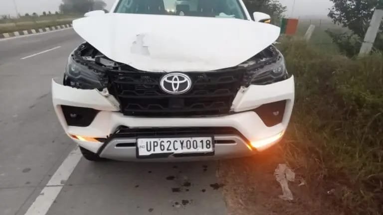 अमूल डेयरी के पास एक गाय अचानक उनकी गाड़ी के सामने आ गई। गाय को बचाने के लिए ड्राइवर ने ब्रेक लगाकर गाड़ी को नियंत्रित करना चाहा परंतु तब तक उनकी गाड़ी आगे जा रही पुलिस की गाड़ी से जोर से टकरा गई। जिससे वो बाल बाल बच गए लेकिन फार्च्यूनर के परखच्चे उड़ गए। उसके बाद वो पुलिस की गाड़ी में बैठकर बाबतपुर पहुच दिल्ली के लिए रवाना हुए।